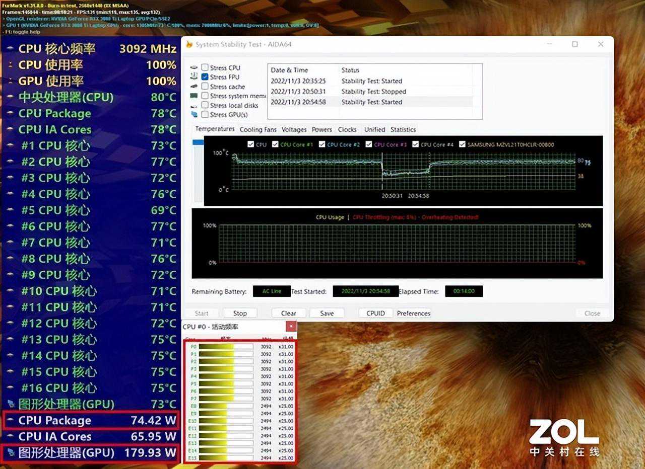 CPU+GPU双烤机测试下,处理器核心温度为69℃-77℃,核心频率稳定在3.1GHz。此时其GPU温度为73℃,CPU+GPU功耗释放达到74.42W+179.93W左右,双烤机甚至峰值可以超过250W满状态释放,且CPU与GPU核心温度控制绝佳!
