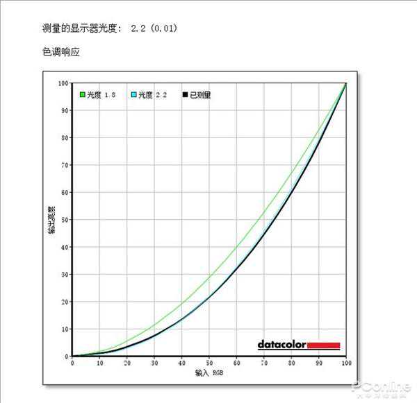 在伽马曲线测试中,测试曲线与光度2.2曲线十分贴合,色调响应表现十分出色。