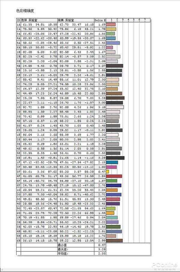 色彩精确度测试,48种颜色的平均△E值为2.33,仔细观察还是能发现细微颜色差异的,但最大△E也才3.29。