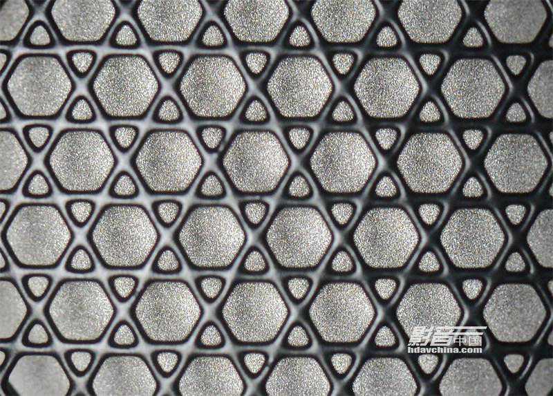 微距镜头下拍摄805D4的CVD钻石振膜高音单元,透过网罩可以观察到振膜的表面是有颗粒感的