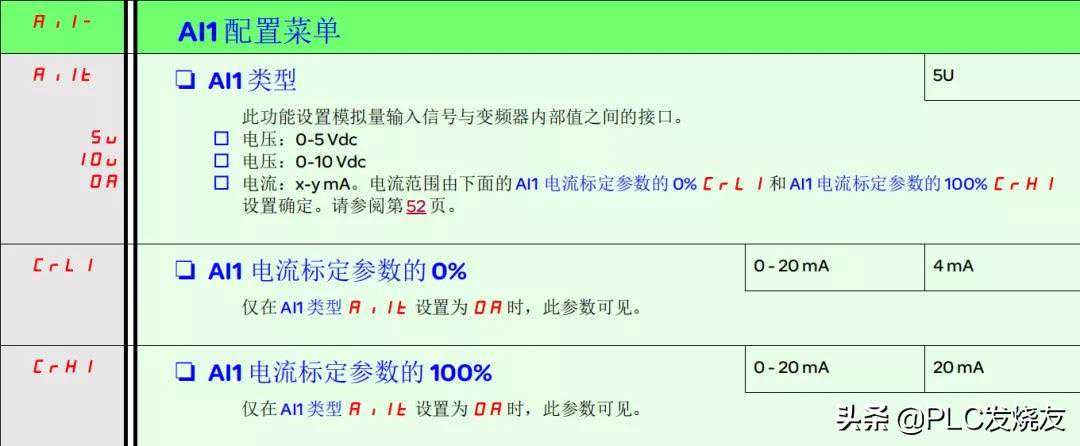2:模拟量控制参数:按MODE键,进入配置模式CONF找到FULL,进去之后找到CtL-,进去之后再找一下FrI,确认里面设置的是AII,说明频率给定是用模拟量控制的。