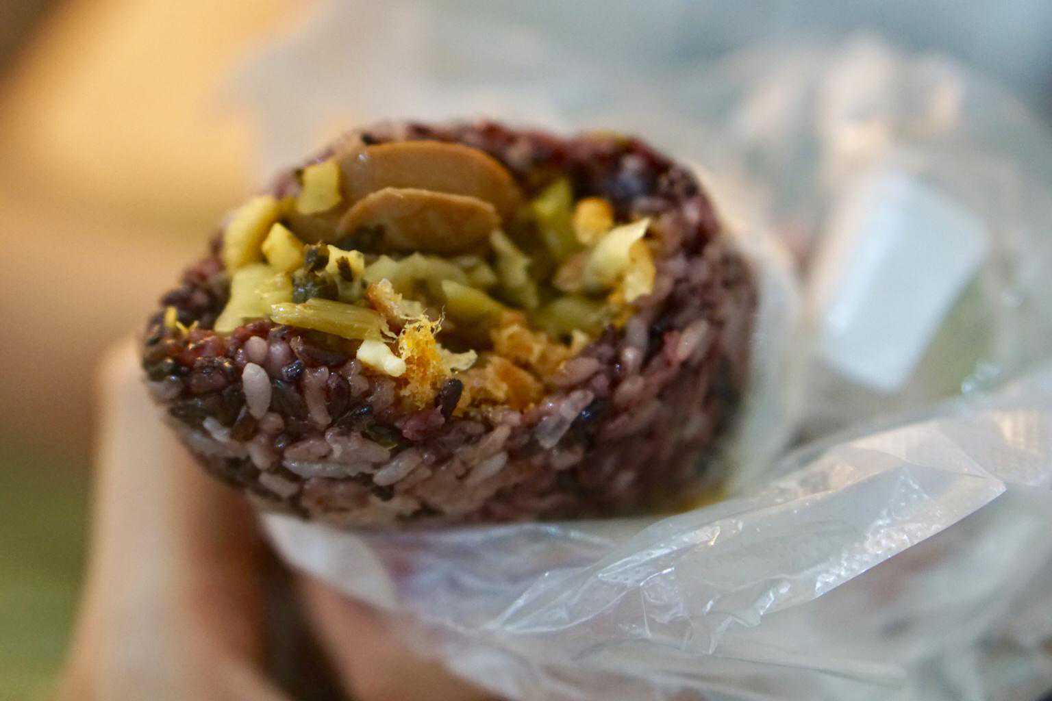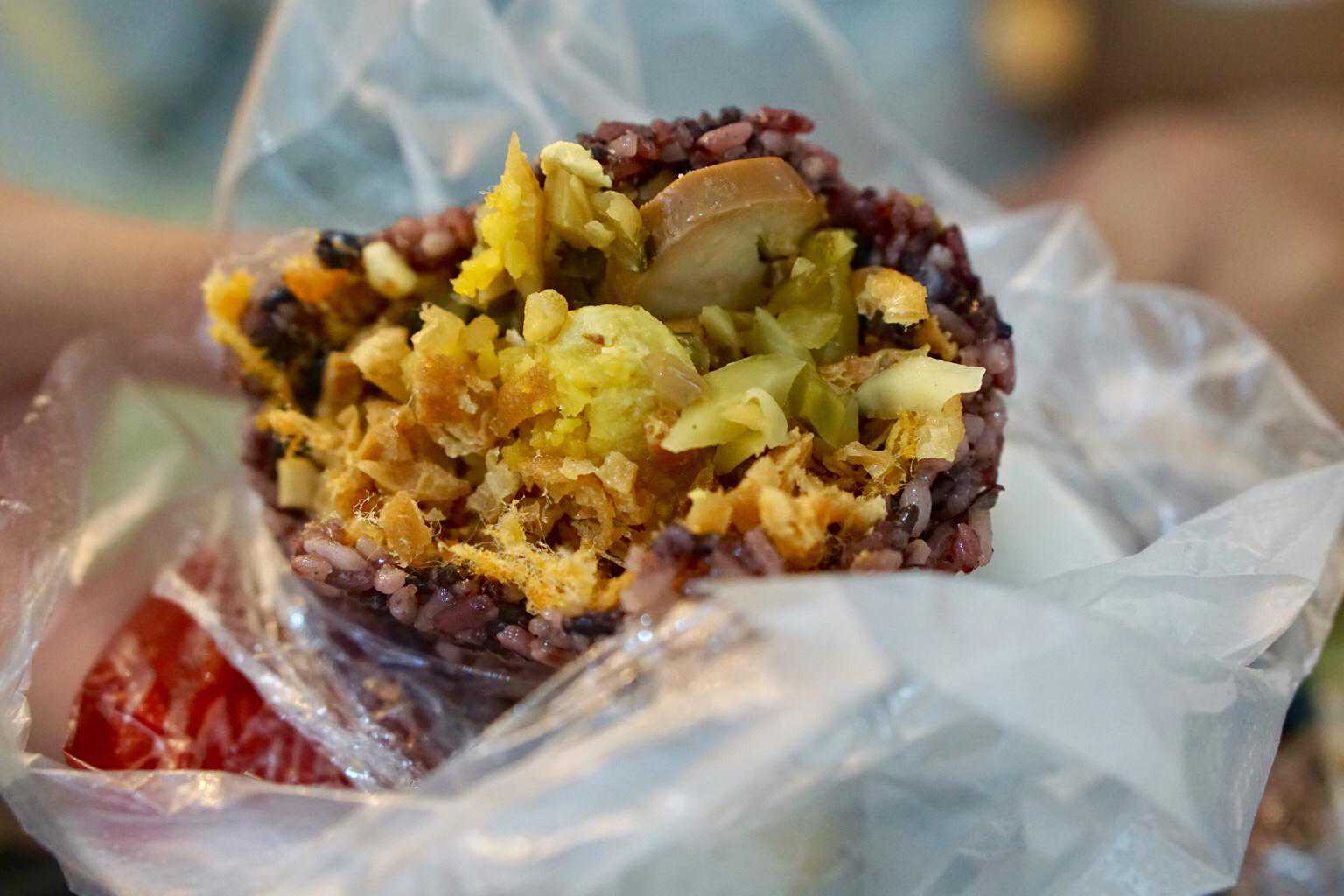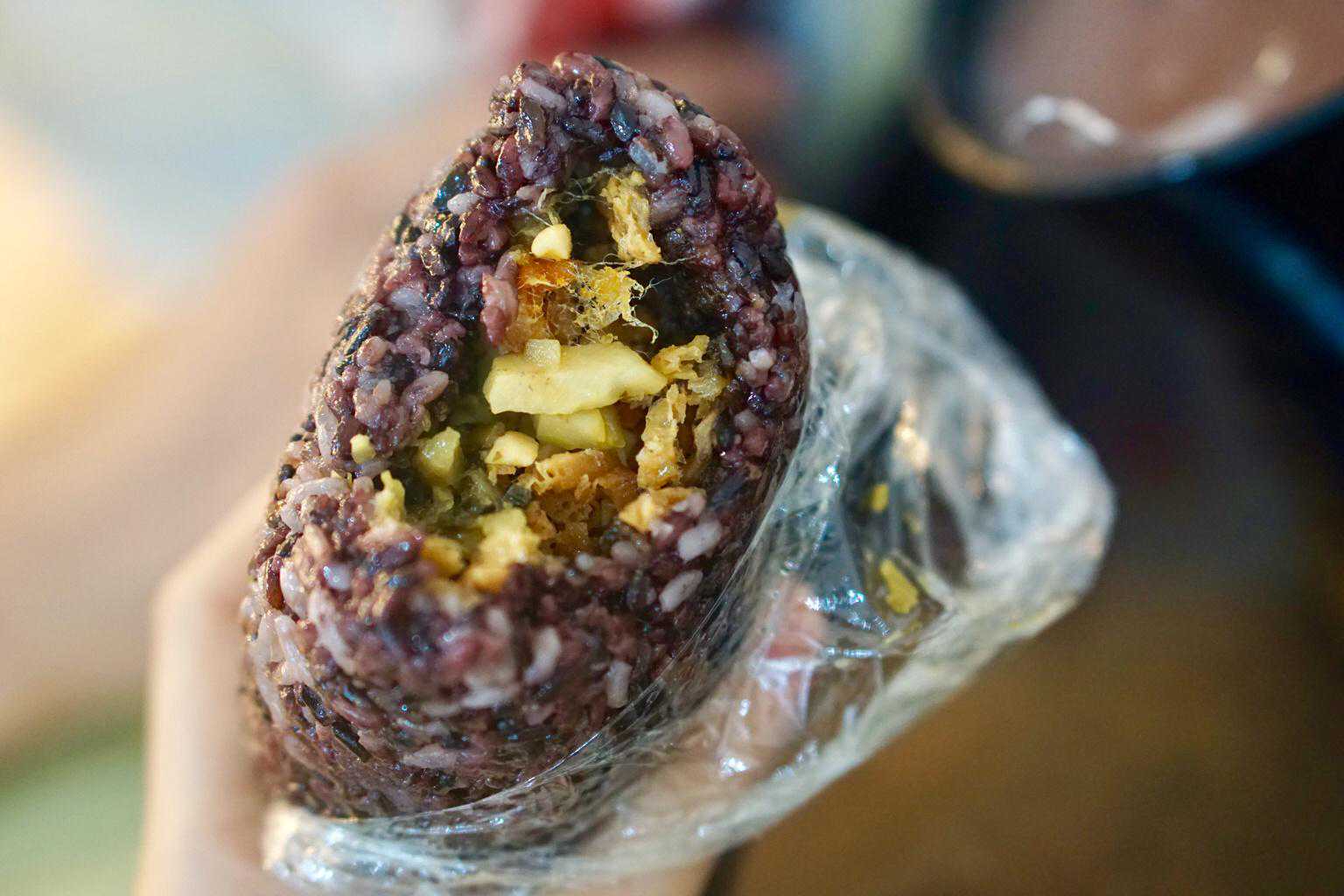 双蛋粢饭团(紫米)店内的饭团可以选择紫米或者白米咸蛋黄➕卤蛋➕肉松➕榨菜➕油条,拿到手的时候非常的烫手,一口下去满满都是料,咸蛋黄和卤蛋的香气浓郁,油条脆脆的口感,咸菜刚好又解腻,热乎乎的时候吃,外面的紫米非常粘糯