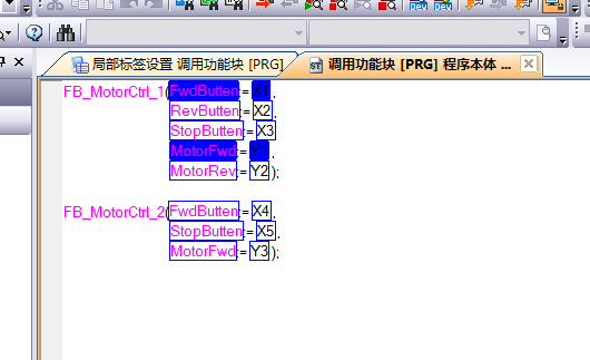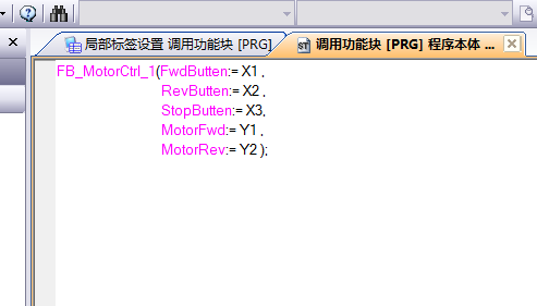 在这里可以看到,功能块的输入端口采用括号的形式引出,而输出端口即可以用括号,也可以用类似结构体调用元素的方式,在FB标签后面加符号点"."引出,并且可以直接使用。