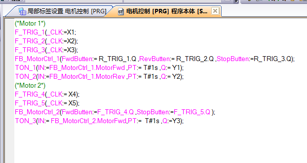 与普通程序的局部标签相比,功能块标签的类多了几个选项,分别是输入变量(input)、输出变量(output)和输入输出变量(in_out),而这几个变量类型也是功能块与外界程序的接口。例如这个程序的按钮变量需要与外界的按钮地址进行连接,而且按钮对于这段程序来说属于控制者,因此把按钮变量声明为input类型;而正反转变量要传递给电机是执行者,因此把正反转声明为output类型;in_out类型即可输入也可输出,本人用的也不多,以后找找资料为大家分享。