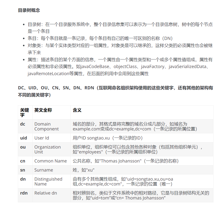 LDAP的目录信息是以树形结构进行存储的,在树根一般定义国家(c=CN)或者域名(dc=com),其次往往定义一个或多个组织(organization,o)或组织单元(organizationunit,ou)。一个组织单元可以包含员工、设备信息(计算机/打印机等)相关信息。