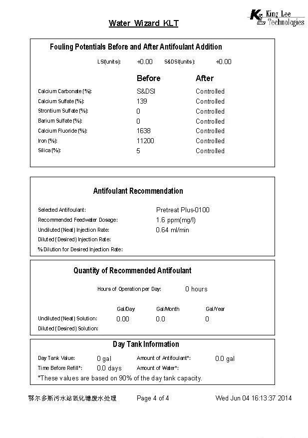 此方案设定的需要进行深度处理的废水水量按150m3/h考虑,自用水由系统自行设计解决。(本系统产品水TDS仅为180mg/l约149.5m3/h建议回用,节约取水及其处理成本,可相应降低本系统的生产成本,产生可观的经济效益)