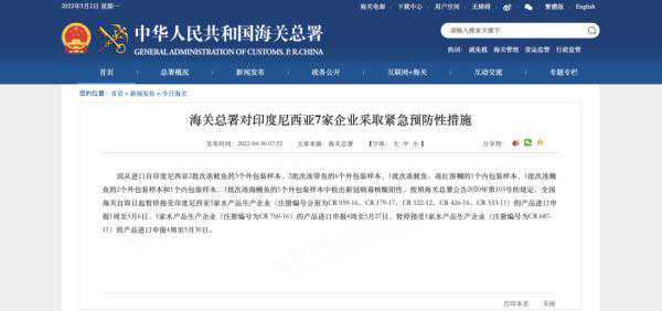 海关总署对印度尼西亚7家企业采取紧急预防性措施
