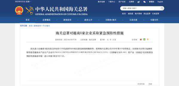 海关总署对越南1家企业采取紧急预防性措施