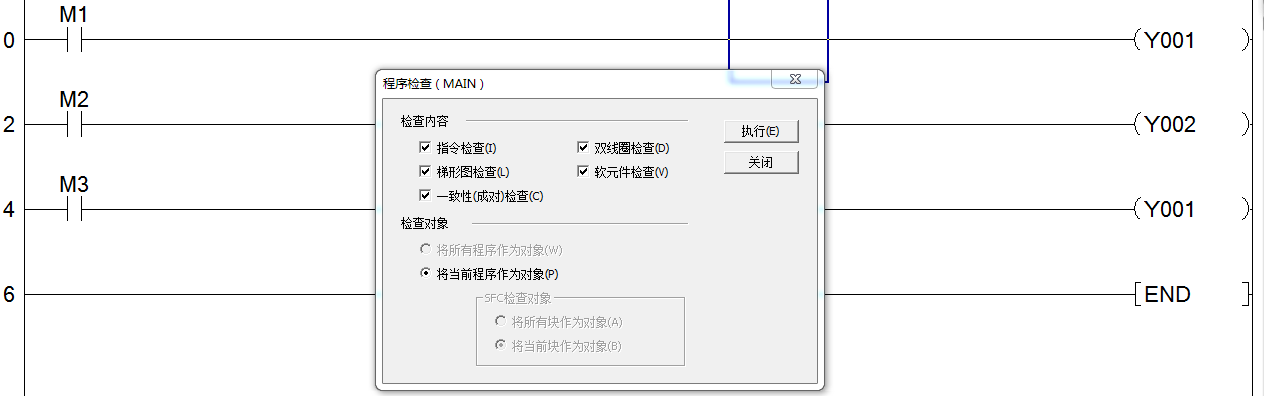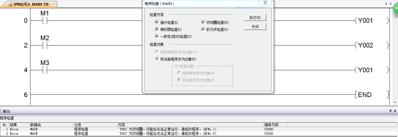 以上可以发现执行线圈的双重输出,输出结果以最下面的线圈为准。这时为什么呢,我们知道PLC程序指令顺序是按照从上到下,从左到右进行处理的,因此双线圈无论前面的状态如何都以最后的线圈为输出结果。