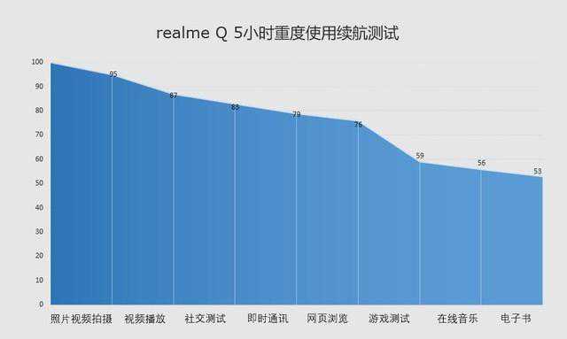 毫不夸张的说,在整个测评过程中最辛苦的地方在于耗费完realmeQ的电量,然后进行充电测试。官方宣称的电池容量为4035mAh(典型值),实际使用时的续航表现十分出色。为了模拟实际的使用过程,这里采用5小时重度续航测试。