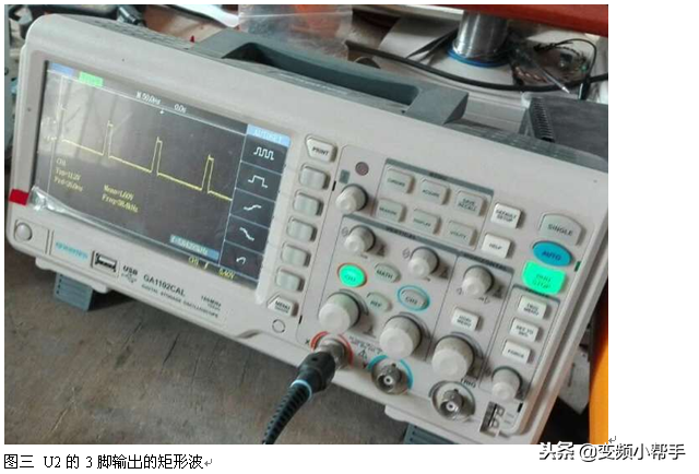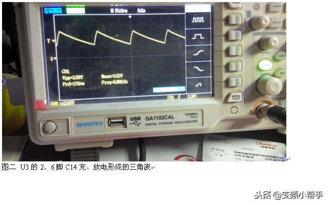 图二为U3的2、6脚C14充、放电形成的三角波(时钟脉冲)。图三为U2的3脚输出的矩形波。