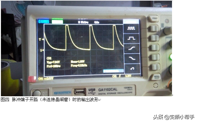 U3输出的脉冲经M1放大,驱动三只脉冲变压器,复经整流后由JP1等端子驱动主电路晶闸管。图四为脉冲端子开路(未连接晶闸管)时的输出波形图,因C6等充电作用,输出波形出现斜坡变化。
