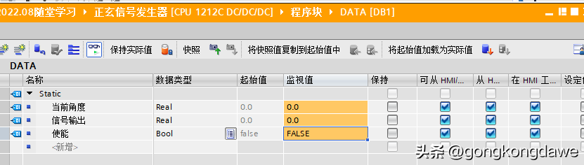 把DB块中使能置1就能监视到正弦波了,感兴趣的小伙伴快去试试吧