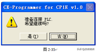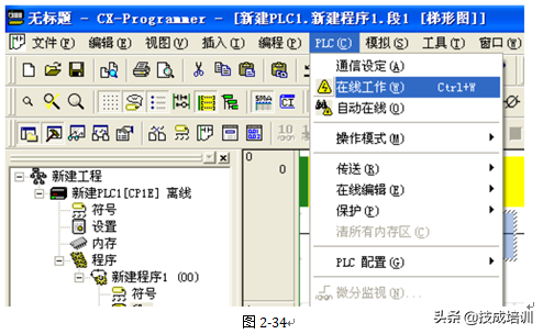 2在CX-Programmer的PLC菜单中选择“联机工作”(WorkOnline),如图2-34。将显示确认联机的对话框。