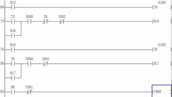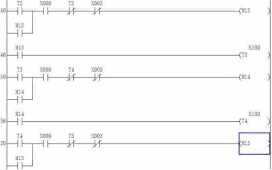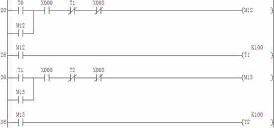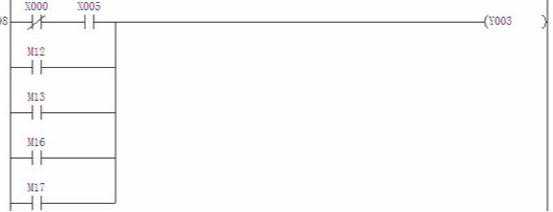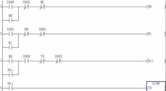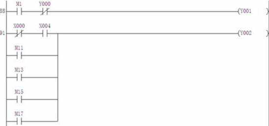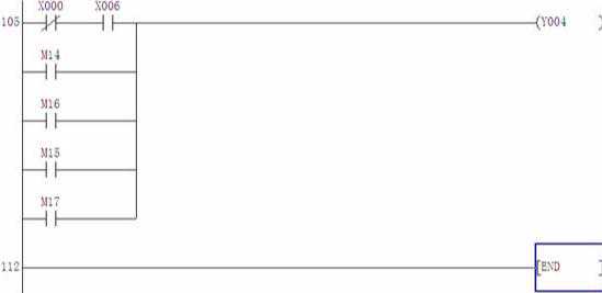 在梯形图程序中,正传运行的时候输出到M0,,反传运行的时候输出到M1,在自动延时改变段速的控制中,通过内部辅助继电器M11到M17来对应7种不同速度的选择。在自动运行情况下,变频器通过三个输入端子(RL、RM、RH)以二进制编码的形式输入,只要M14、M15、M16、M17任何一个输出为1,则有RH输出;M12、M13、M16、M17任何一个输出为1,则有RM输出;M12、M13、M15、M17任何一个输出为1,则有RM输出。在手动控制下,段速的选择是通过外部开关直接编码输入的,可以直接控制输出RL、RM、RH。