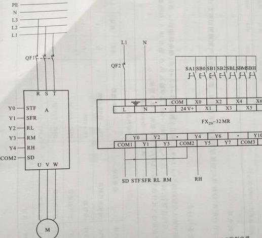 第三步根据I/O口分配表,绘制PLC、变频器多段速控制原理。控制电路如下所示。