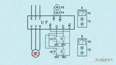如图5所示,SB1和SB2是一组升速和降速按钮,安装在控制盒CA内,由“频率表”FA显示其运行频率;SB3和SB4是另一组升速和降速按钮,安装在另一个控制盒CB内,由“频率表”FB显示其运行频率。控制盒CA和CB分别放置在两个不同的地方。