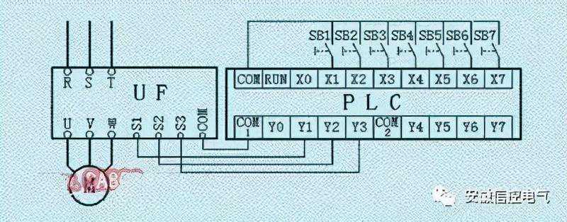如图,PLC的输入端X1~X7分别与按钮开关SB1~SB7相接,用于接受7档转速的信号。