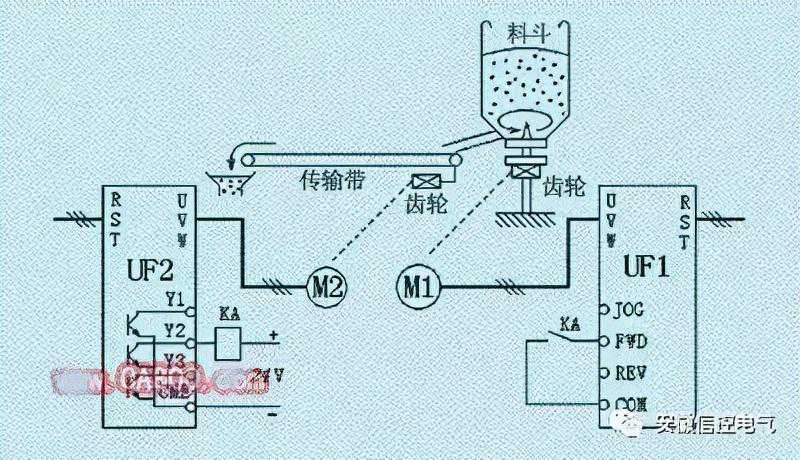 有一台搅拌机,需要和传输带进行联动控制。搅拌机由电动机M1拖动,转速由变频器UF1控制;传输带由电动机M2拖动,转速由变频器UF2控制,如图17所示。