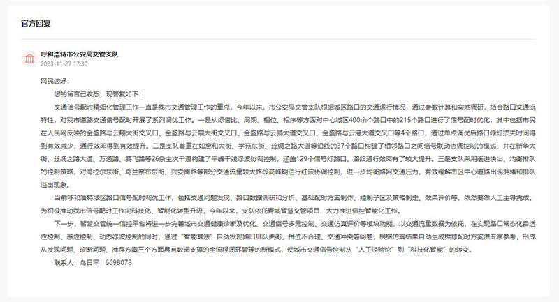呼和浩特市公安局交管支队对该网友的留言作出答复:“交通信号配时精细化管理工作一直是我市交通管理工作的重点,今年以来,市公安局交管支队根据城区路口的交通运行情况,通过参数计算和实地调研,结合路口交通流特性,对我市道路交通信号配时开展了系列调优工作。”