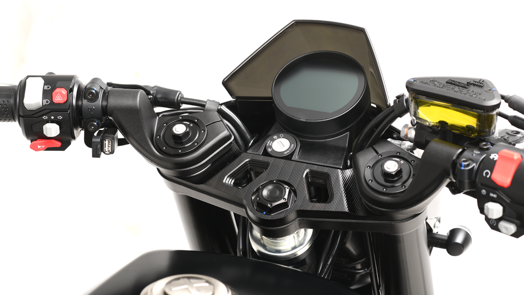 车把采用分离式低把位设计,营造更为低趴的战斗姿态,还原那个年代的味道。而且个人觉得这个外形很百搭,穿日常休闲服、竞技皮衣都没什么不妥的感觉,但我个人认为还是一身西服配上复古盔才是最帅的。