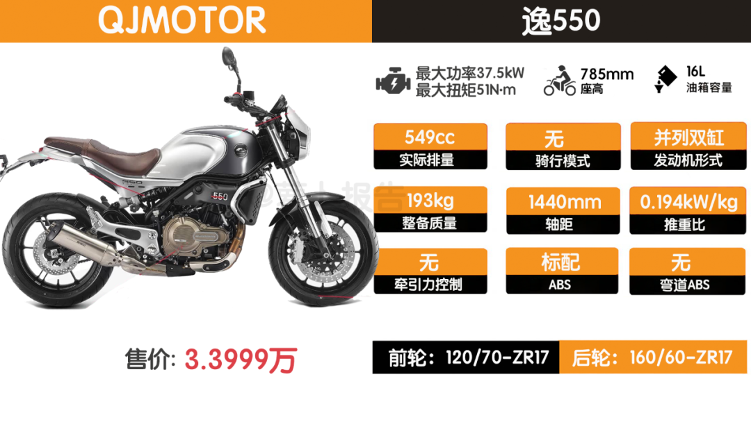 QJMOTOR逸550也算是竞争对手,更大的排量带来更强劲的动力,并且外观也不难看。和无极AC525不同,个人觉得它在复古和现代元素之间更偏向复古元素。另外它的售价也要比高金GK500咖啡版R低为3.3999万。