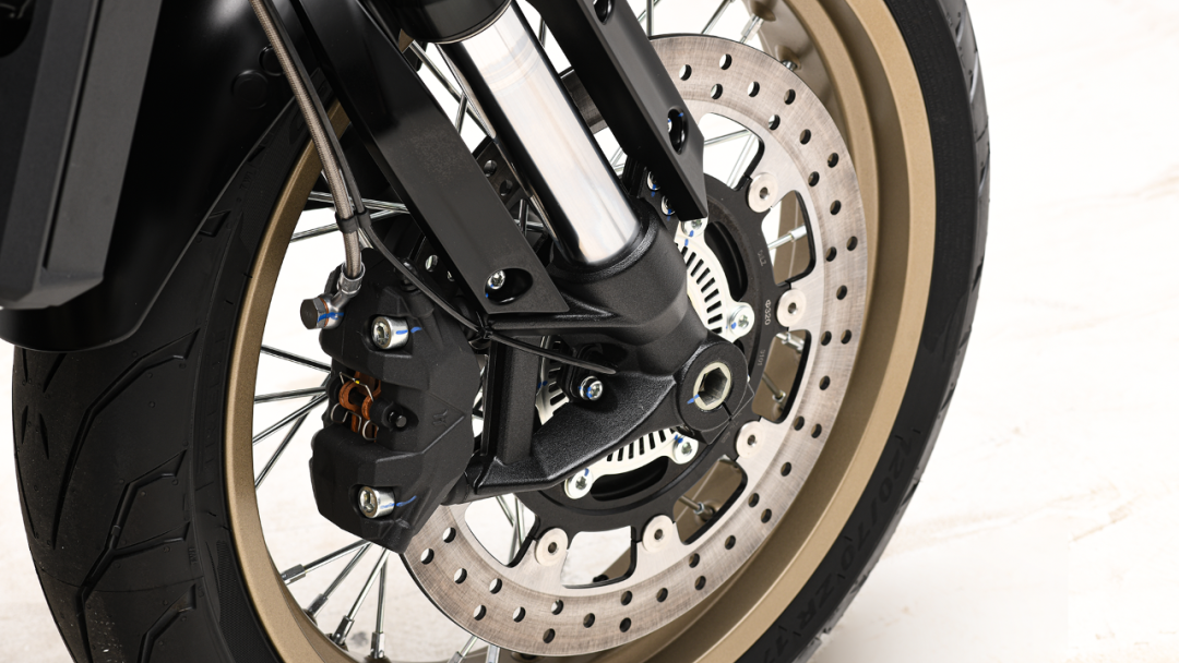 咖啡版R配备了前120/70-ZR17,后160/60-ZR17的倍耐力天使胎,真空辐条轮毂也为颜值加分不少。这套轮胎在之前我们接触过不少,算是倍耐力性价比较高的一款轮胎,耐久性要好一些,但在抓地和运动表现上略逊一筹。应对咖啡版R还是够用的,如果您想要更好的操控表现可以考虑更高级别的恶魔系列或是CST的S1系列。