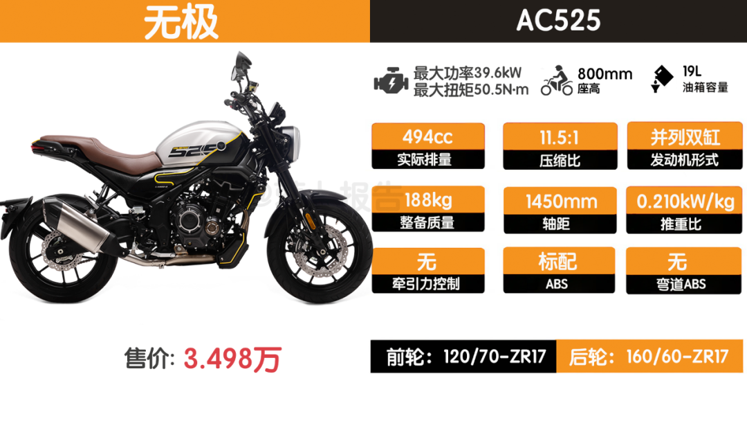 再有就是无极AC525,国产同级中它的动力属于上游水平,颜值也较高,但风格略有不同。这点从它“复古先锋”的系列名称就能了解。整体设计的天平稍稍偏向现代时尚元素一边,更适合现在的年轻人。