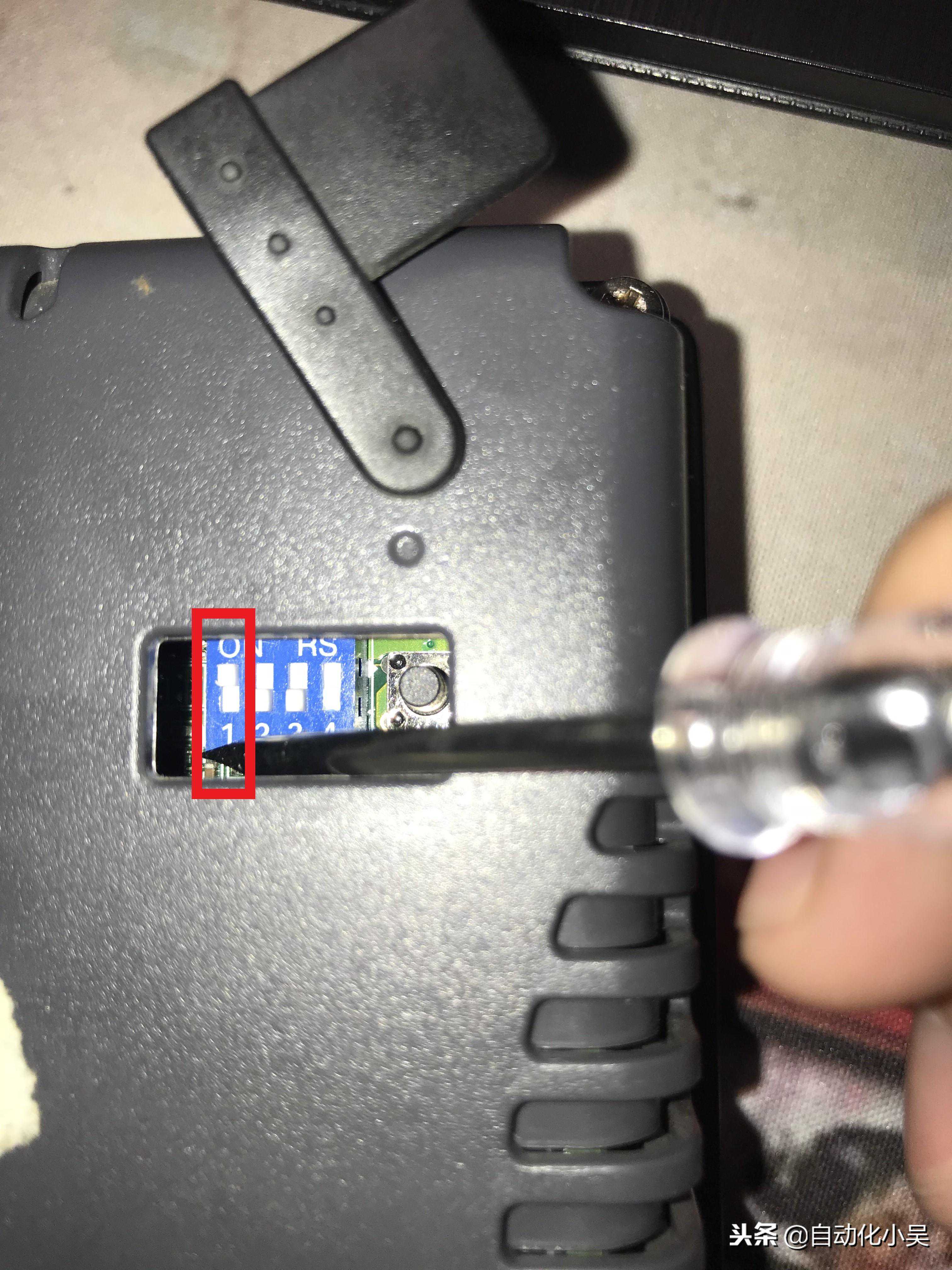 设备有一个隐蔽窗口,里面是四个拨码开关和一个按钮开关,按钮开关作用是重启,其他的我还没有去研究,只知道第一个开关是进行屏幕矫正和恢复出厂化的,将第一个开关打到ON位置,然后重新上电。