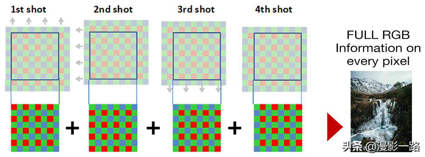 首先,两者实现的原理就有很大差异,简单来说,三脚架高分辨率曝光模式是一个感光元件按程序既定的像素移动规律,通过影像传感器的有规律"抖动"来实现的。你可以把它简单地想象为所有像素按照"上→左→下→右→上"这样的移动轨迹,各拍一张照片,最后合成为一张超高像素照片。