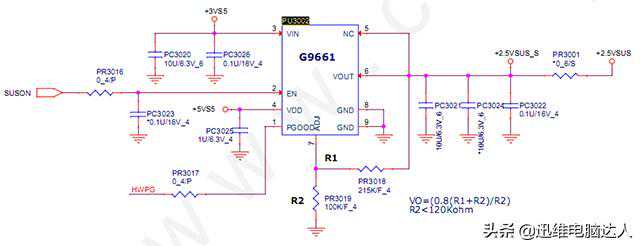 再测量EC的条件,发现ADP_ID只有0.58V,应该有1.0V才会识别到适配器,从同行那里调取HP原装适配器,上电,按开关瞬间有3V和5V,按一次开关测一次电压,除了CPU电压、集显和独显没有,其它的瞬间都有,感觉应该是有短路保护了。一路查找,当测5VS5时测量到PU3002芯片第6脚VOUT无输出,断电打值第6脚为0,短路了!