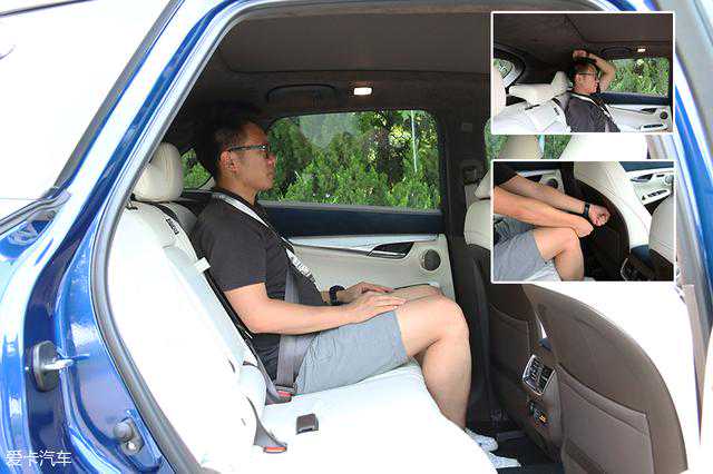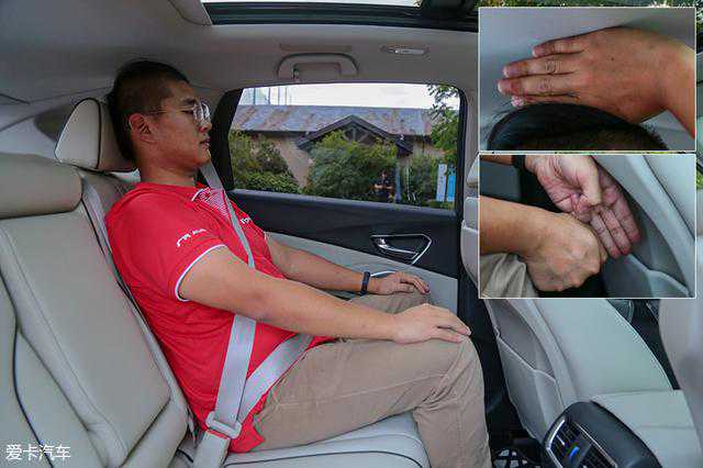 保持前排座椅位置不变,相同体验者来到后排,此时头部空间剩余四指,腿部空间剩余一拳三指。