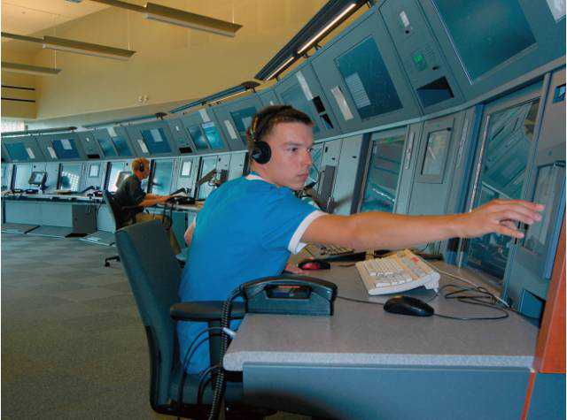 这样巨长的控制台只有在每个操作员都是独立操作、平行操作的时候才好,需要紧密配合的话,距离太远了。这是空管控制台,正好符合独立、平行的条件。