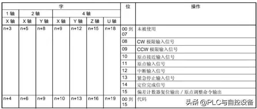 m+2轴参数定义(标识指定)。参数标识占用00-07位,轴标识占用08-15位。参数标识中,00,使用快闪存储器中的轴参数;01分配给特殊IO单元的数据存储区为轴参数。轴标识中,08为x轴定义,09为y轴定义,10为z轴定义,11为u轴定义。位为0,使用分配给特殊IO单元的数据存储区域中的轴参数设置;位为1,使用缺省轴参数设置。