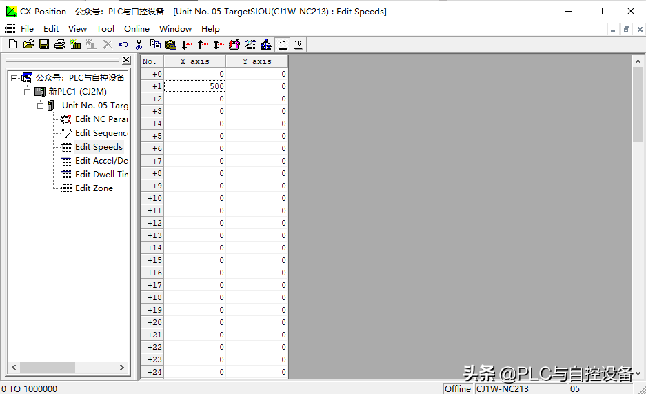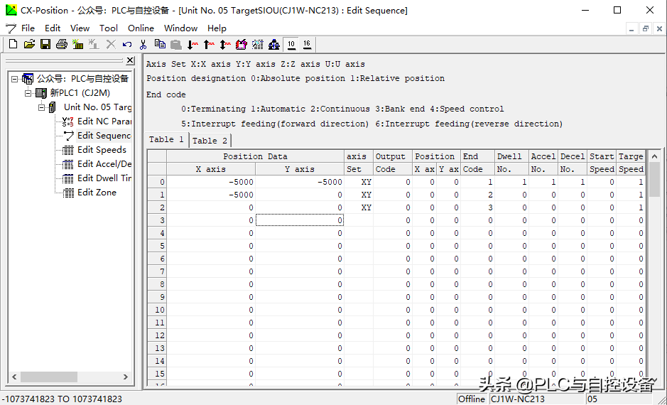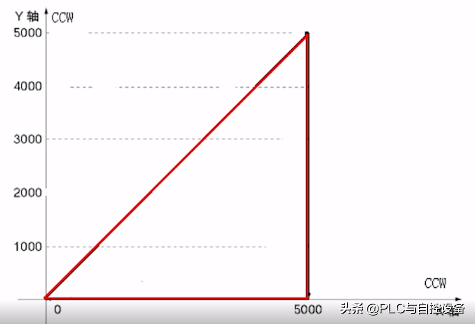 利用CJ1W-N213的内存操作,完成如上图所示的定位要求:xy轴直线插补从(0,0)移动到(5000,5000),然后y轴回到0点,x轴回到0点,插补速度为500。