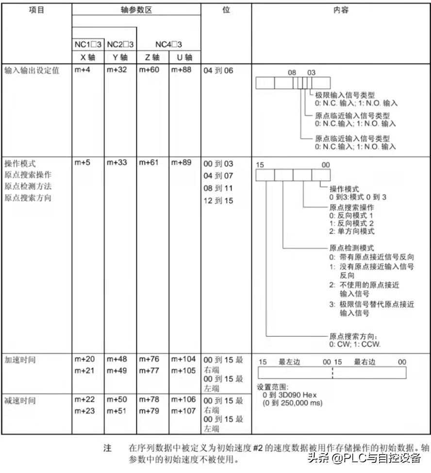 m+4~m+59/m+115为轴(x、y/x、y、z、u)参数区域。在IO表中通过特殊IO单元号设定轴参数。