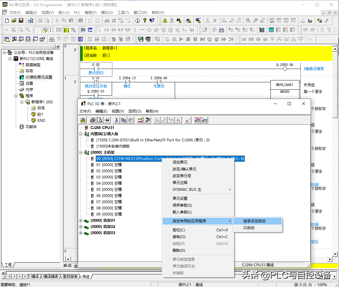 在CX-Programmer中创建IO表,右击NC模块,选择“启动专用应用程序”→“继承设定启动”,打开CX-Position软件。