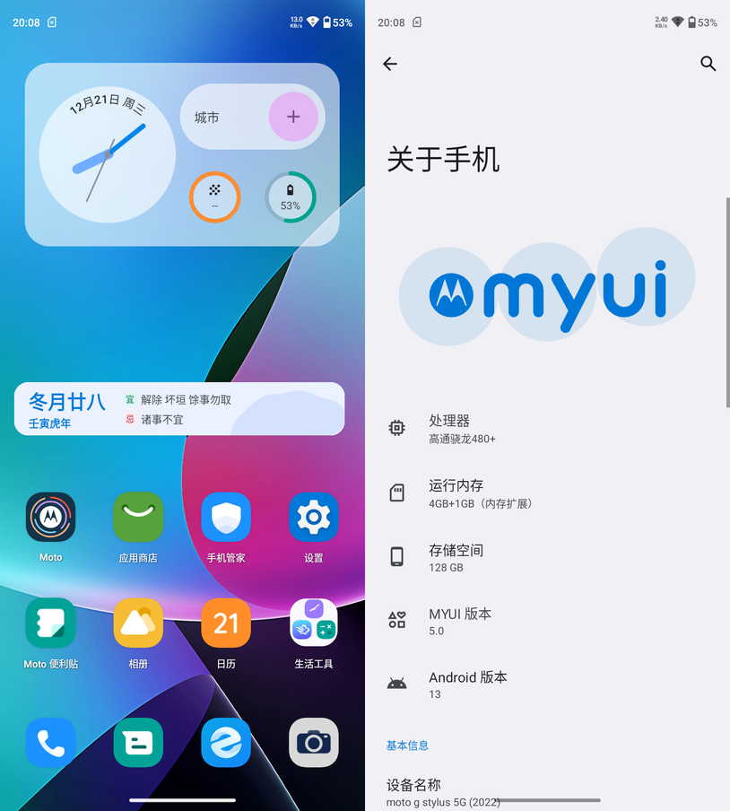motoG53本次搭载了最新的,也是目前全新的系统,基于安卓13深度定制,整个UI的界面色彩也变得更精致,符合当下年轻主流审美。图标也做了扁平化处理,看起来也简单易懂,也支持当下流行的小部件功能增加易用性,而且整个第三方图标也是圆角矩形的,整体的统一性不错。最关键的是依旧保持“好、轻、快”的特点,没有广告,运行还非常流畅,对于用户来说,没有垃圾信息打扰,就是实用性很高的一个优势。