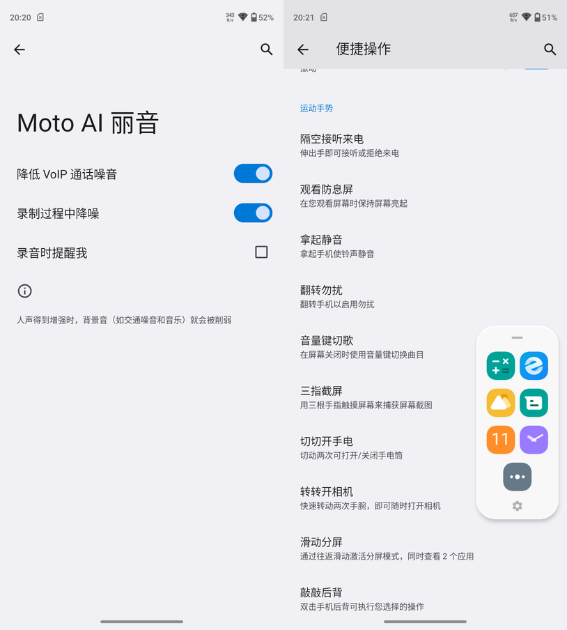 考虑到长辈用户对于通话质量肯定有要求,motoG53也拥有moto引以为傲的moto丽音技术,它能在通话中明显的降噪,而且还支持超级免提,在免提模式下,即使距离3米远也能精准拾音,使得用户能听清对方说的什么、对方也能听清你在说什么。便捷操作上motoG53也支持多种手势、侧边栏等,像是三指截屏、转动开相机、滑动分屏等等。
