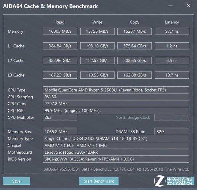 联想IdeaPad720S搭配了DDR42133单通道内存,我们将其核心性能测试成绩为您展示如下:
