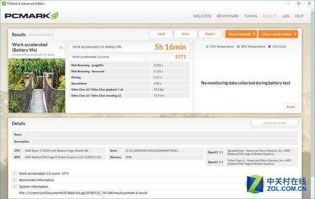 在PCmark8续航测试中,Work模式、平衡电源、百分之七十五亮度的IdeaPad720S获得了5小时16分的续航成绩,超过了很多8代酷睿独显轻薄本。