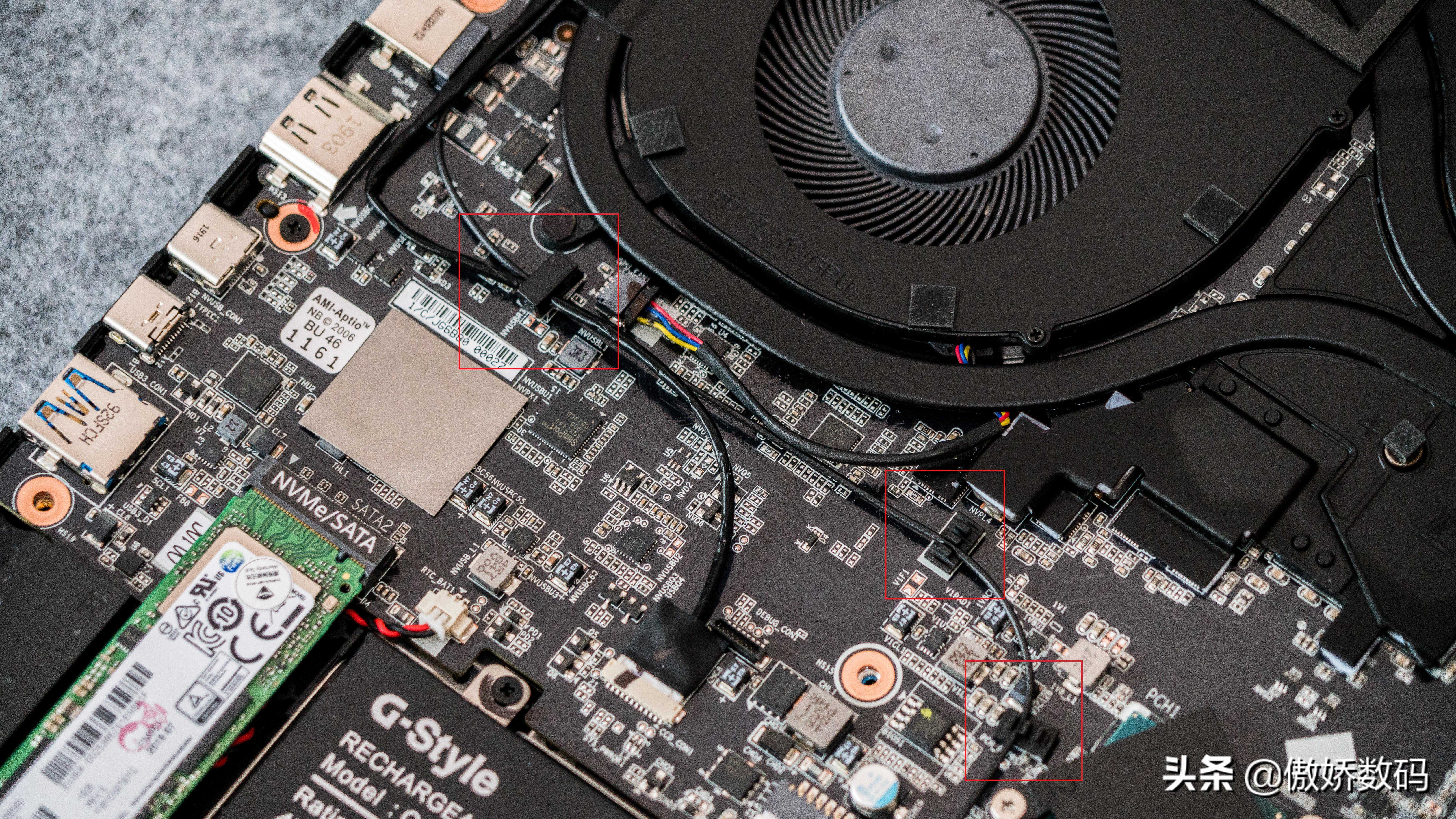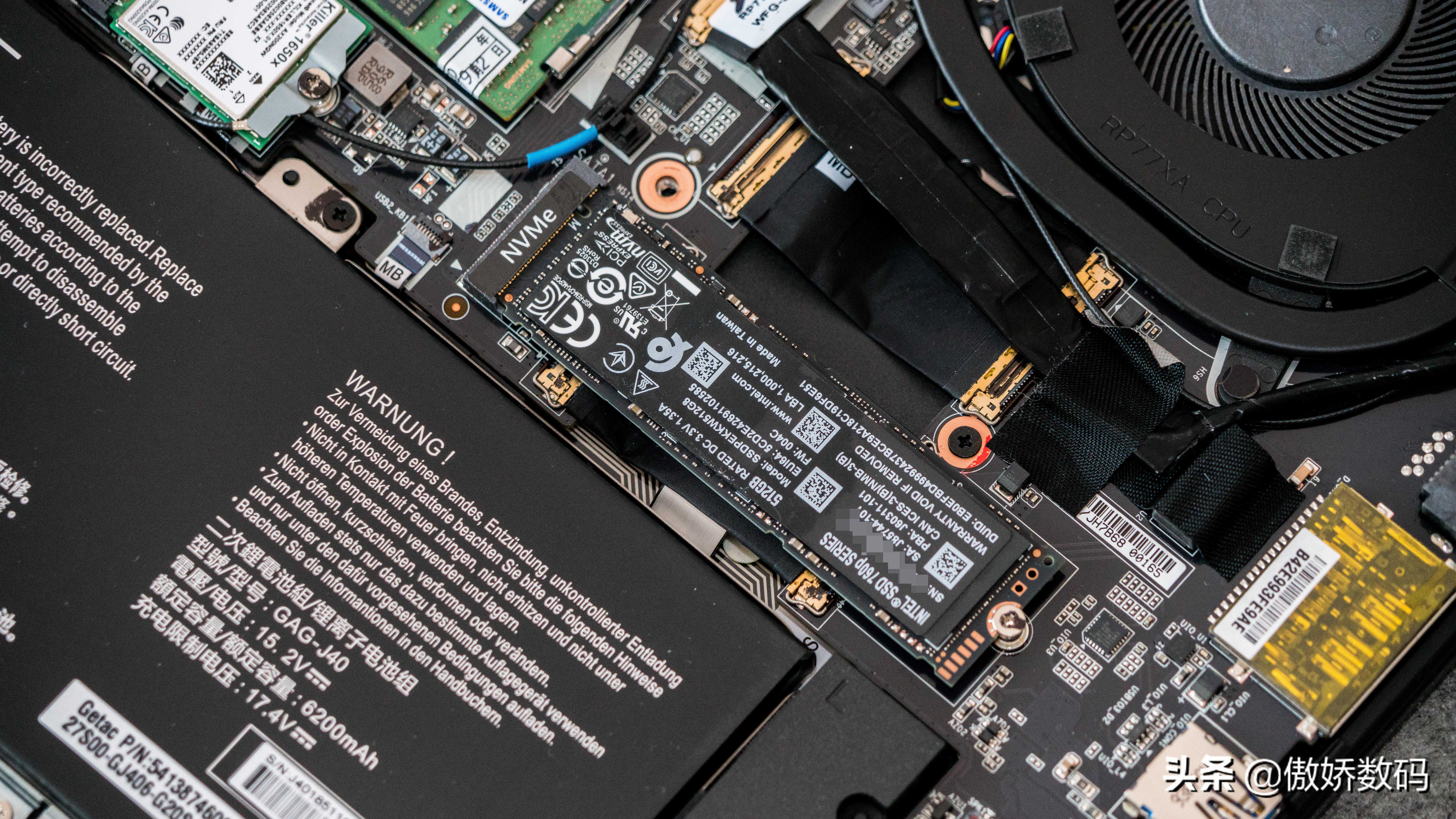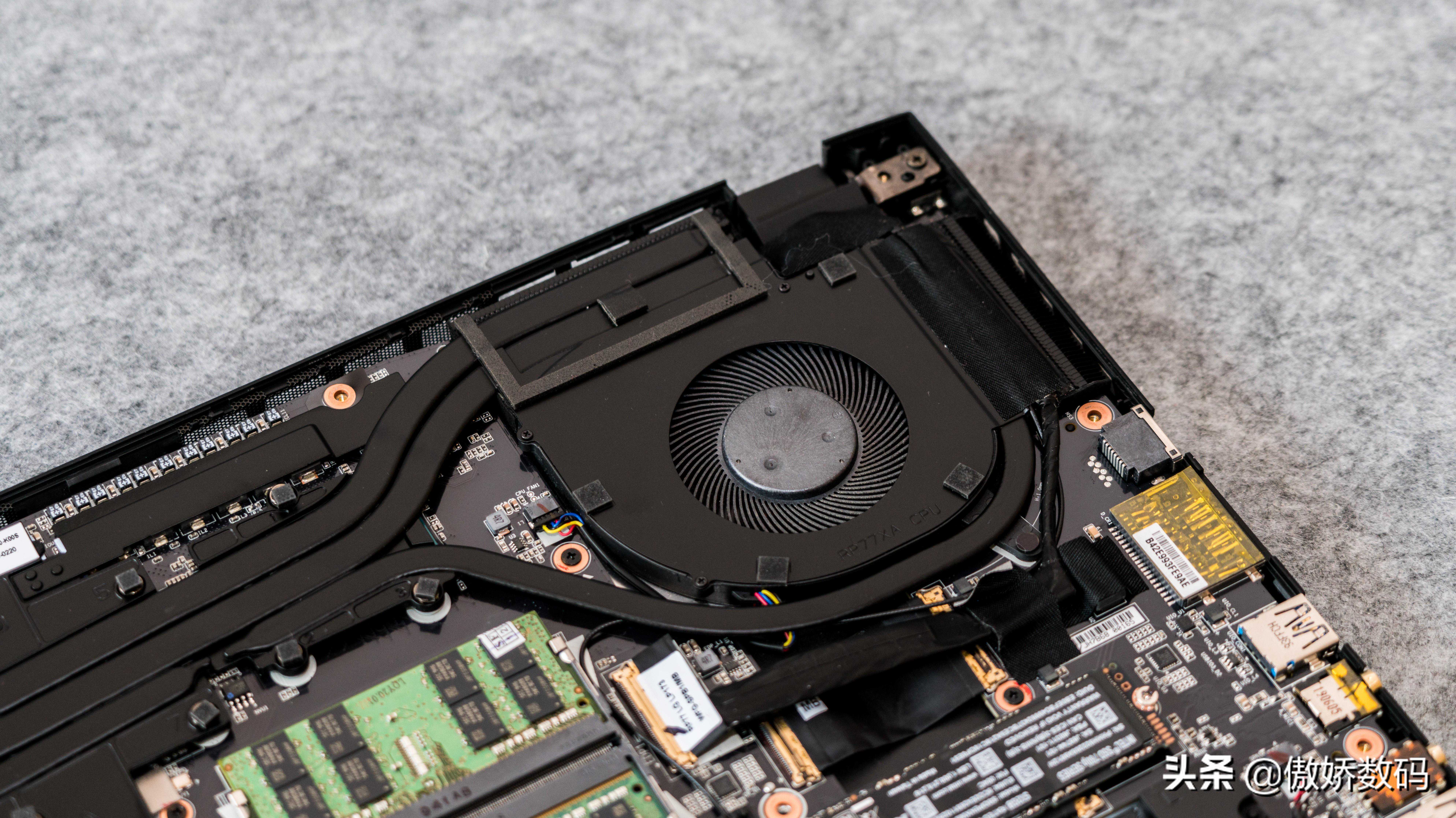 整机内部元件就是这样,大致分为三部分,分别是上方的散热,中部的内存板卡,和最下方的电池