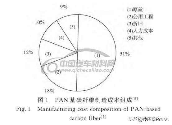 由于汽车是大宗产品,在其生产时需同时考虑可靠性和经济性。碳纤维的高成本严重地制约了碳纤维复合材料在汽车上的大规模应用。在2010年,碳纤维成本超过30美元/kg,而低碳钢的成本不到1美元/kg,铝合金为(2.4~2.6)美元/kg。只有将碳纤维成本降低至(11~15.4)美元/kg,抗拉强度不低于1.72GPa,弹性模量不低于172GPa,碳纤维复合材料才有可能大规模用于汽车。因此,降低碳纤维成本成为当务之急。