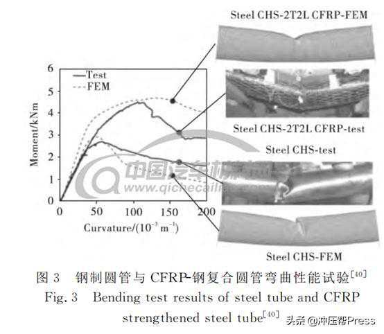 2003款DodgeViper采用了仅有4个部件组成的碳纤维复合材料挡板支架。该结构较原钢结构的零部件数量减少了15~20个,质量减轻至6.1kg,减重高达18kg。梅赛德斯奔驰SLR采用两根圆锥形碳纤维复合材料纵梁制成的前端整体结构,有效提高结构的制造装配工艺性同时保证结构的耐撞性。宝马公司在2016款7系轿车的A柱、B柱、C柱与门槛等部位大量采用了碳纤维复合材料与钢或铝合金组成混合结构,实现轻量化的同时保证整体结构的力学性能。Do-HyoungKim等在汽车保险杠上采用玻璃纤维/碳纤维的混杂纤维结构取代传统的玻璃纤维结构,并采用微遗传算对保险杠3个不同部位的结构进行优化设计,在提升结构碰撞性能的同时减重33%。对装备了碳纤维复合材料增强钢制吸能管(如图3所示)的两款车型Yaris和Silverado进行NCAP正面碰撞试验,结果表明,在质量增加140kg与560kg的情况下不影响正面碰撞中的耐撞性。他们又对由CFRP-钢复合圆管组成的车顶结构进行了侧面压溃过程的有限元模拟与试验分析,该组合结构的强度/质量为原结构的2倍左右,在结构保持强度不变的条件下替代原钢结构可实现减重37%~68%。刘强等采用二维编织复合材料设计了整体式电动汽车车身结构,并建立了从细观尺度到宏观尺度的碳纤维编织复合材料车身有限元模型(如图4所示),该结构与原玻璃纤维复合材料结构相比减重达28%,同时在侧面压溃、碰撞中的耐撞性相应得到提升。