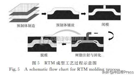 树脂传递模塑(RTM)成型技术是复合材料液体模塑成型技术(LCM)的典型工艺之一。其主要工艺原理是先在模腔中铺放按结构和性能要求设计好的纤维增强材料或预成型件,然后采用注胶设备将专用低粘度树脂体系注入或真空吸入闭合模腔内,充分浸润纤维,树脂固化脱模得到复合材料构件(如图5所示)。RTM工艺可以一次成型大型、复杂的构件,可设计性强,尺寸易于控制,表面质量高,生产周期短,可实现半自动化或自动化生产。传统汽车覆盖件的冲压工艺生产只需几秒钟,而普通RTM成型工艺较长,总的成型时间一般在2h以上,仍然存在效率较低的问题。因此,需要开发快速固化树脂体系与合理的成型工艺方法来缩短RTM的成型周期。