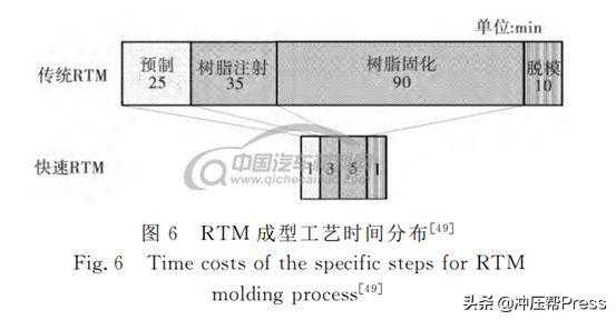 在传统RTM成型过程中(如图6所示),树脂的固化过程占成型过程的大部分时间,因此快速固化树脂体系是实现RTM高效成型过程的首要条件。东丽公司采用低粘度(低于300mPa·s)、高性能、快速固化环氧树脂和多口注射工艺,使得一体式车架的成型时间缩短为10min。陶氏汽车系统采用改进的快速、低粘度VORAFORCE5300环氧树脂系统,配合HP-RTM工艺可将固化成型时间控制在60s以内。美国瀚森公司推出的汽车用复合材料快速固化环氧树脂在RTM成工艺中的成型周期不到1min。张靠民等采用改性的双酚A环氧树脂体系制备碳纤维复合材料层合板,结果表明该树脂的成型固化时间可控制在13min以内,固化度达95%以上。虽然RTM成型过程中低粘度树脂的快速固化可有效提升生产效率,但往往会导致制品力学性能降低,这也是树脂制备过程需要考虑的重要问题。
