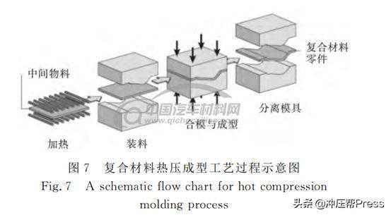 热压成型工艺是在一定的温度与压力下,树脂基体发生熔融流动,重新浸渍纤维,从而制备一定形状的复合材料零件,如图7所示。热压成型工艺具有较短的成型周期,易于实现自动化生产过程,可使用传统金属板料成形设备,同时适用于热塑性复合材料的低成本制造过程,对于碳纤维复合材料汽车零部件的高效成型具有广阔应用前景。