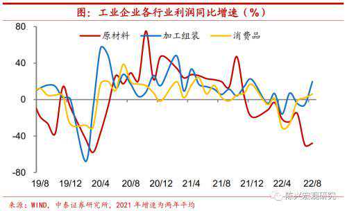 分行业来看,在41个工业大类行业中,有27个行业利润增速较上月有所上行,占比超六成,其中多数为中下游行业。具体来看各行业利润表现,8月采矿业利润增速较上月延续回落;在工业生产持续恢复叠加高温天气的影响下,用电需求旺盛导致电力行业利润快速恢复,带动原材料行业利润增速保持平稳。在产业链供应链进一步畅通的背景下,中游加工组装制造业利润降幅明显收窄,利润占比提高,其中,锂离子电池、光伏设备和空调制造等行业带动电气机械行业利润增速较上月加快11.1个百分点,仪器仪表行业利润增速也由负转正。随着促消费政策效应不断释放,市场需求有所回升,多数消费品行业利润改善,8月下游消费品制造业利润同比降幅明显收窄,盈利状况有所好转,在14个消费品制造行业中,有9个行业利润较上月改善,受支持汽车消费政策等因素推动,汽车制造业产销进一步加快,利润同比增长1倍,为一年来最高增速,此外,酒饮料茶和文教工美等行业利润增速较上月也有明显加快。