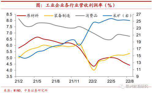 从营收结构上来看,8月PPI增速显著下行,“价”对利润增长的拉动作用加快减弱;而工业增加值增速较上月反弹,“量”的贡献有所回升;营收利润率有所回落,每百元营收中的成本费用同比也有走高,反映工业企业的成本水平仍然较高,经营压力有所增加。